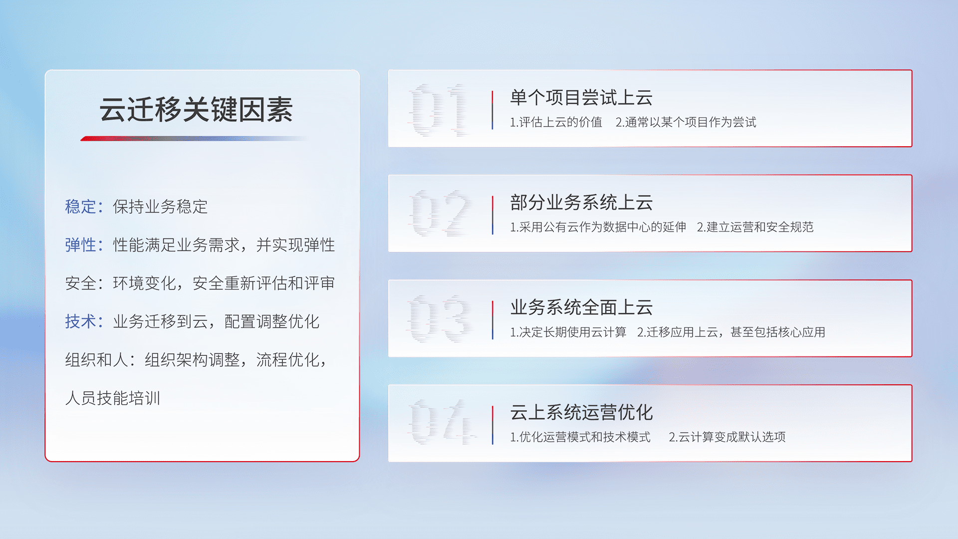 结合实际业务,,从规划设计、、云平台选型、、、、云原生改造、、、、数据迁移、、、、集成交付,,迁移全过程为客户识别最佳上云路径,,,做好风险识别管理,,,设计网络架构、、、身份权限、、、、安全审计合规、、、操作审计、、日志审计、、、、监控告警策略、、、、多站点容灾设计等,,,,对云上基础设施进行整体规划,,提升IT治理水平,,以满足弹性、、、高可用、、、、高性能的需求。。。