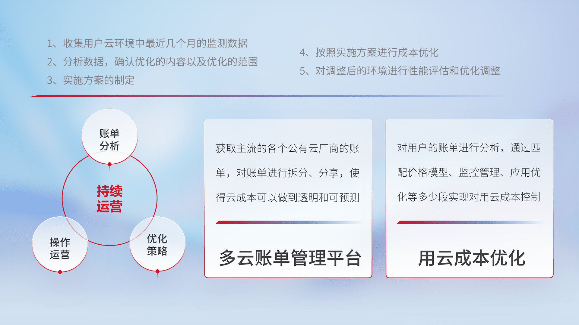 通过多云纳管,,,,以统一的资源数据模型把客户的云资源进行抽象和封装,,进而实现对多云资源的统一操作,,保障云资源管理的可靠性、、稳定性与可用性。。量身定制化运维内容,,,配置、、开发运维、、补丁管理、、备份、、、监控、、、认证和访问管理、、审计和日常巡检等,,保障在用云过程中的可靠度,,稳定度以及高可用率。。。。
