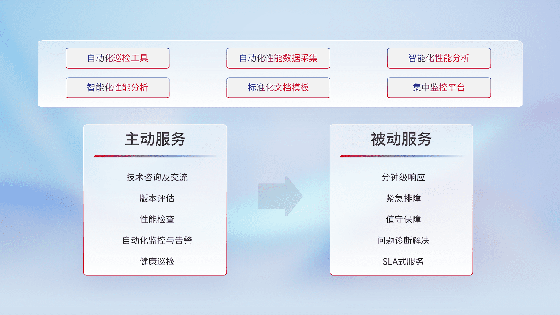 智能化工具和标准化文档,,保障服务质量,,,提供主动服务(包含技术咨询、、、、版本评估、、、性能检查、、自动化监控与告警、、、、健康巡检)和被动服务包含(分钟级响应、、、紧急排障、、、、值守保障、、、问题诊断解决、、、、SLA服务)。。。